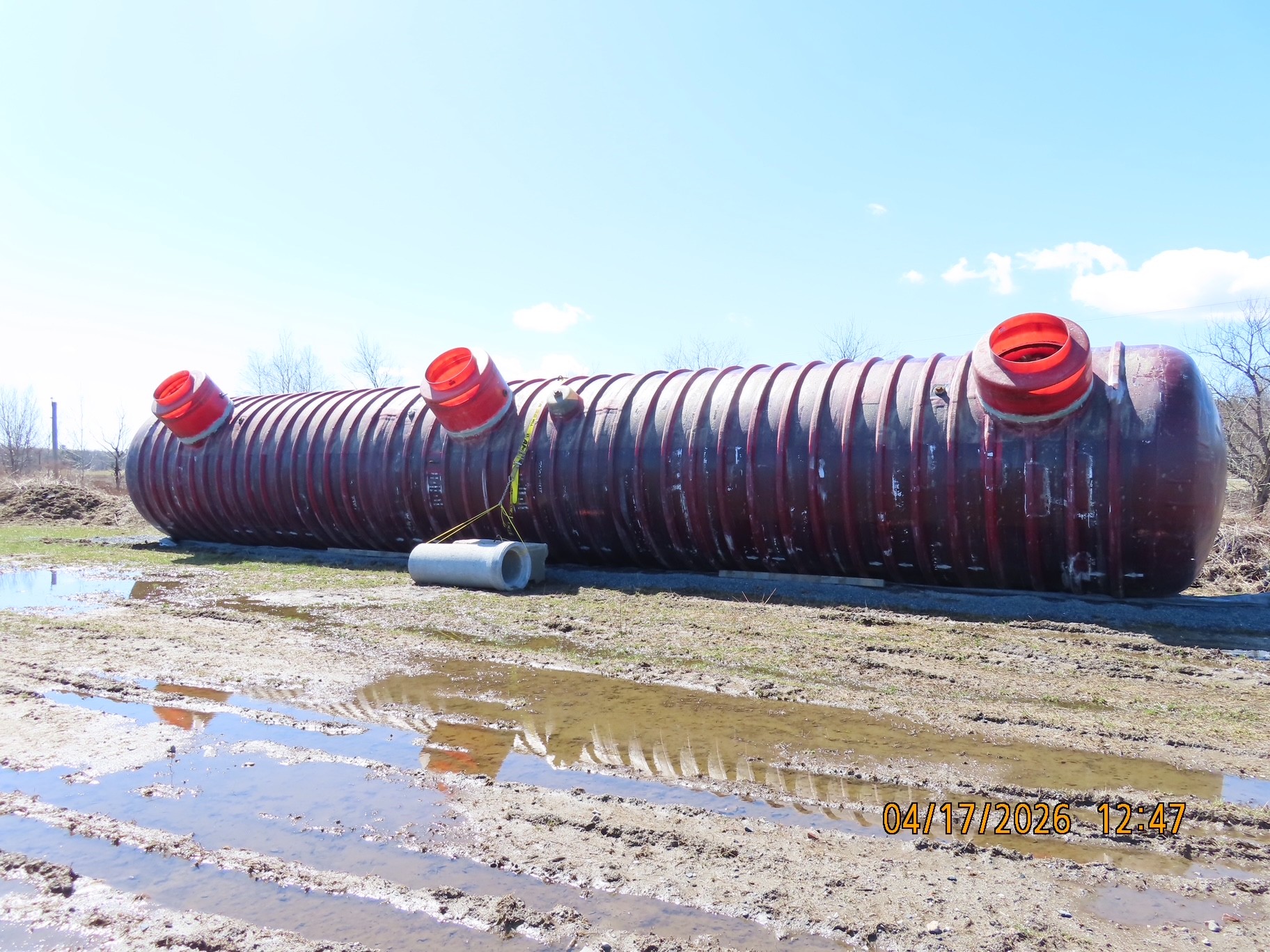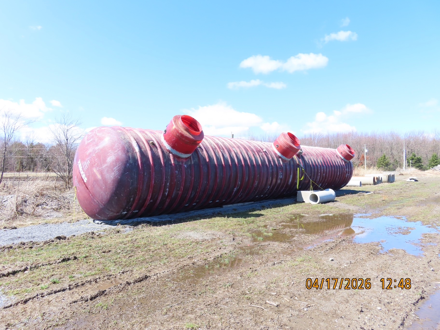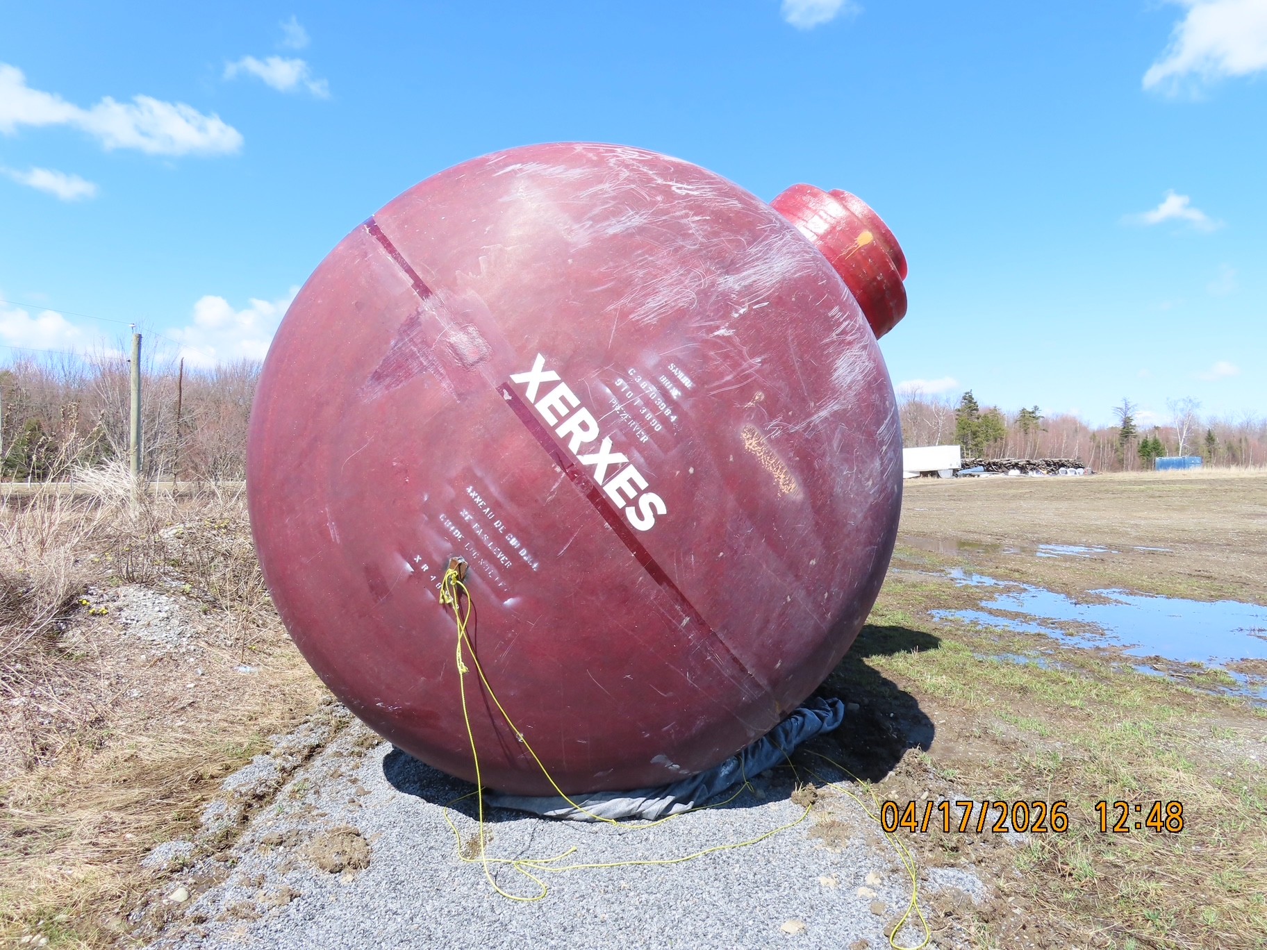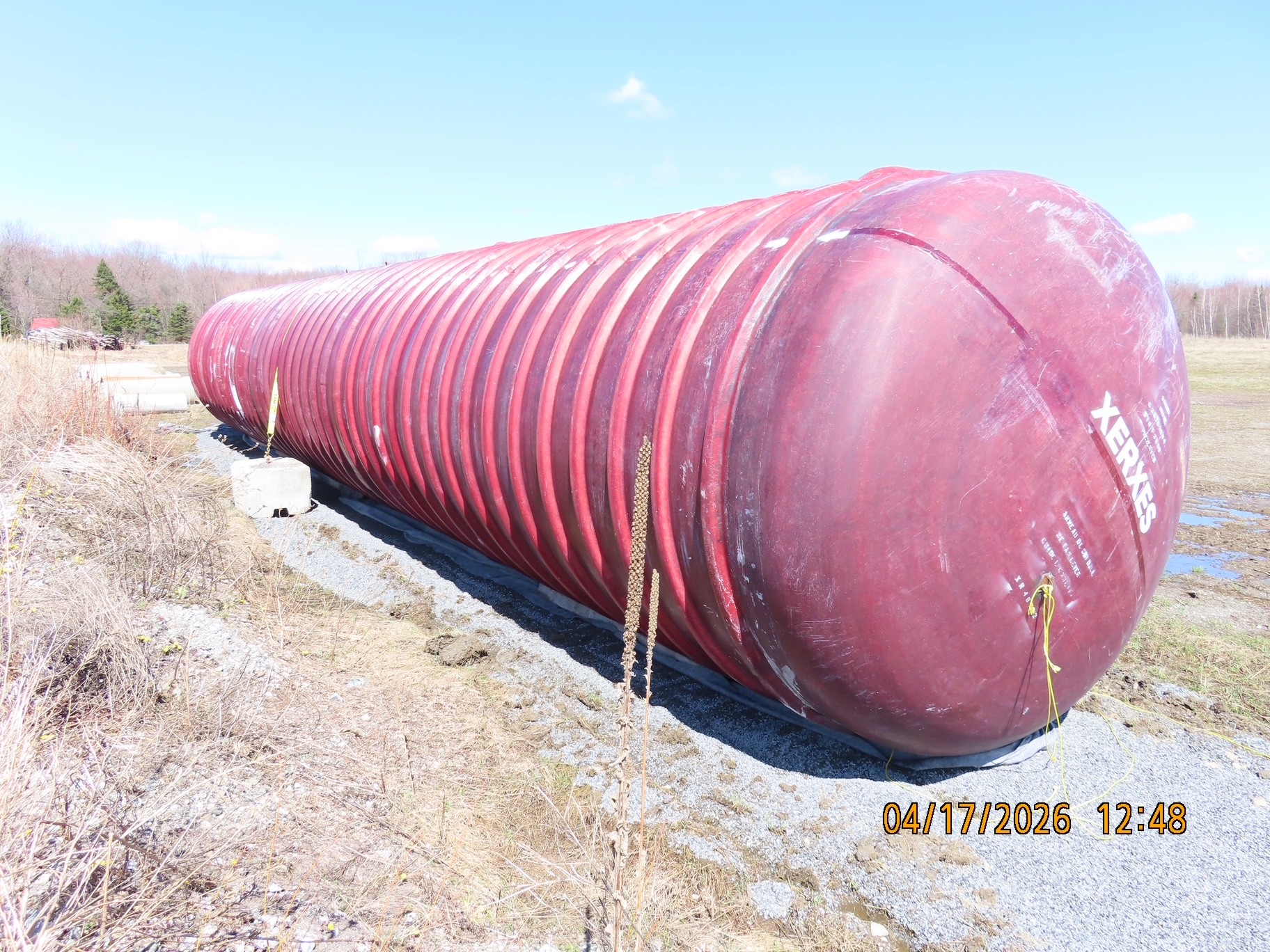 Réservoir à double paroi (3 m x 19,8 m) en fibre de verre, fabriqué par Xerxes. Capacité : 140 000 litres. Ce réservoir n'est pas utilisable comme réservoir de carburant souterrain, mais il pourrait avoir de nombreuses autres applications. Le réservoir n'a jamais été utilisé. Au cours de l'inspection finale, le fabriquant a détecté une légère déformation.